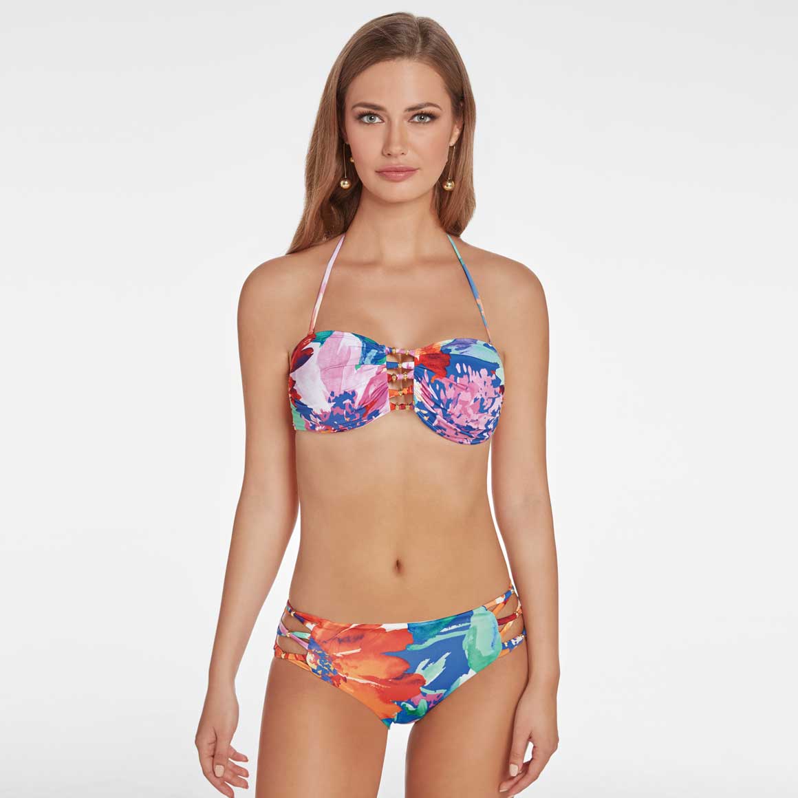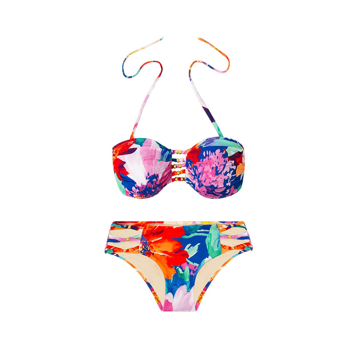 Traje de baño de dos piezas, elaborado de microfibra estampada. top tipo bondeau con tirantes halter y removibles, copas ligeramente prehormadas sin realce con cordones y detalles metálicos en centro de escote, varillas laterales y centrales, elástico en espalda y banda de amarre en la parte posterior. panty con talle medio y cobertura completa, detalle de cordones laterales que dejan al descubierto los lados, forro de poliéster, elastico escondido en pierna y cintura.