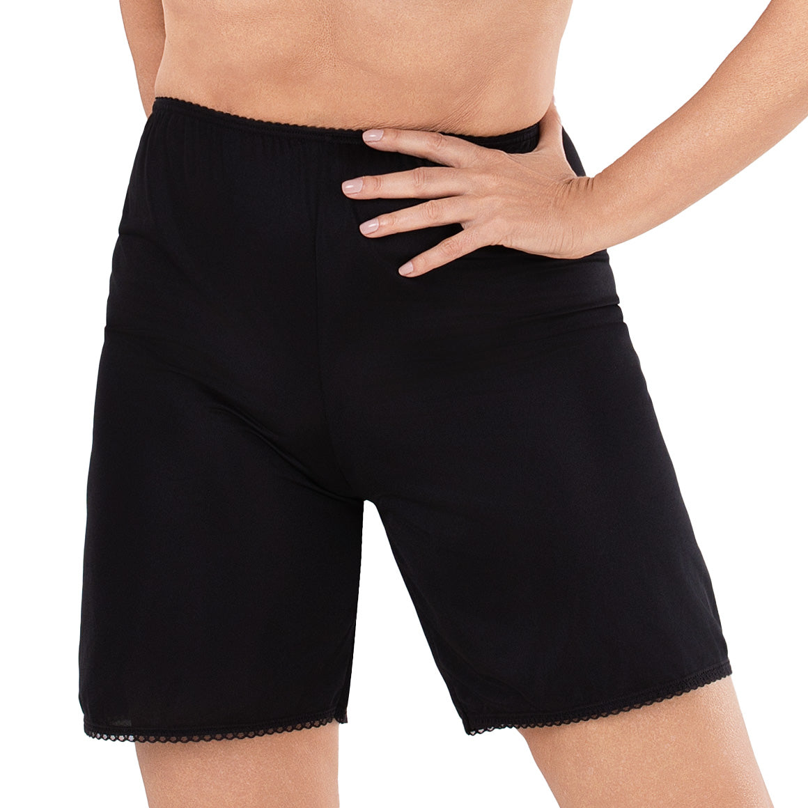 Saya pantalón con talle alto. elaborado de nylon, elastico en cintura para un mejor ajuste y con detalles de encaje en el ruedo.